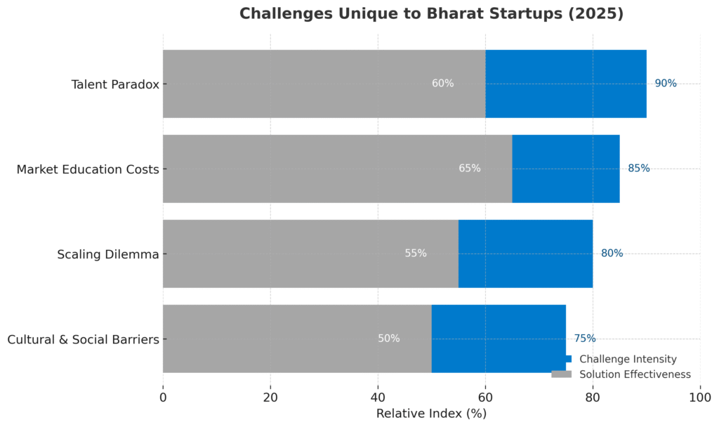 Bharat startups: ~40-50% fail within 3 years (bootstrapped means lower burn, but market education costs and talent constraints increase risk)