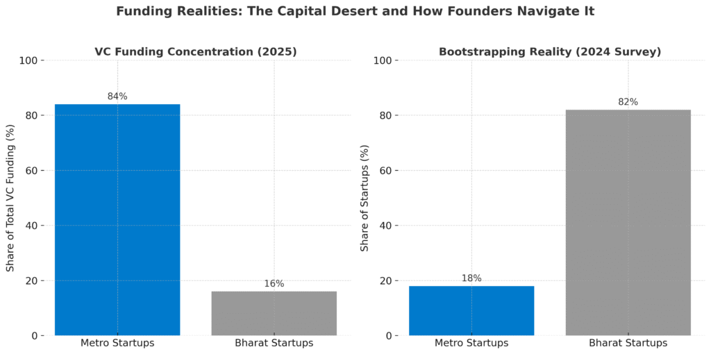 Funding Reality: Despite representing 58% of startups, Bharat ventures captured only 11% of total venture funding in 2024 (₹8,200 crore out of ₹75,000 crore, according to Bain-IVCA India Venture Capital Report 2025). The funding-per-startup ratio tells the story: metros average ₹18 crore per funded startup; non-metros average ₹2.3 crore.