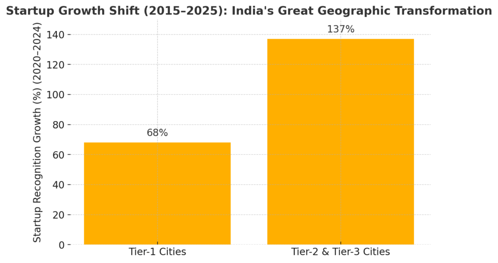 The COVID-19 pandemic accelerated this shift. Reverse migration brought thousands of professionals back to their hometowns—armed with metro experience, global exposure, and startup know-how. DPIIT data shows that between April 2020 and December 2024, startup recognition in Tier-2 and Tier-3 cities grew by 137%, compared to just 68% in Tier-1 cities.