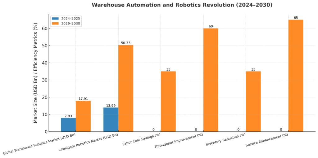 - Labor Productivity: 40-60% improvement through warehouse automation and optimized picking processes
