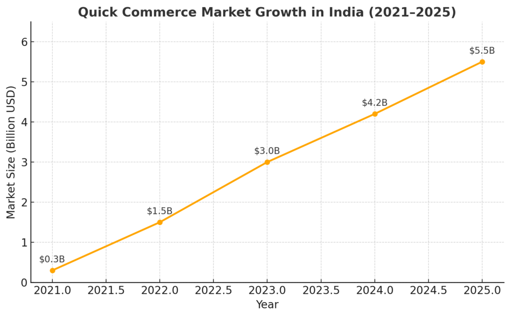 According to Redseer, India’s quick commerce market is projected to grow from $0.3 billion in 2021 to $5.5 billion by 2025. In metros, quick commerce already accounts for 7–10% of daily grocery sales.